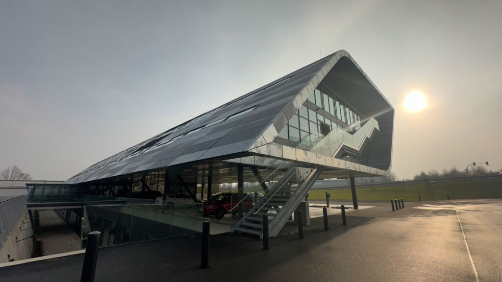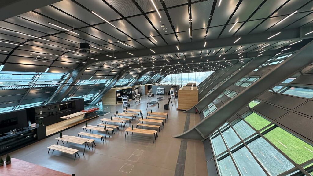 Der Bau vereint Ausstellung, Eventfläche, Showküche und Gastronomie. Große, teils transparente Fassadenelemente sowie sichtbare Stahlrahmen spiegeln technische Präzision und Offenheit wider. Zwei riesige Cabrio-Schiebedächer über dem Restaurant schaffen bei gutem Wetter ein außergewöhnliches Raumgefühl – ganz ohne Verkehrslärm.