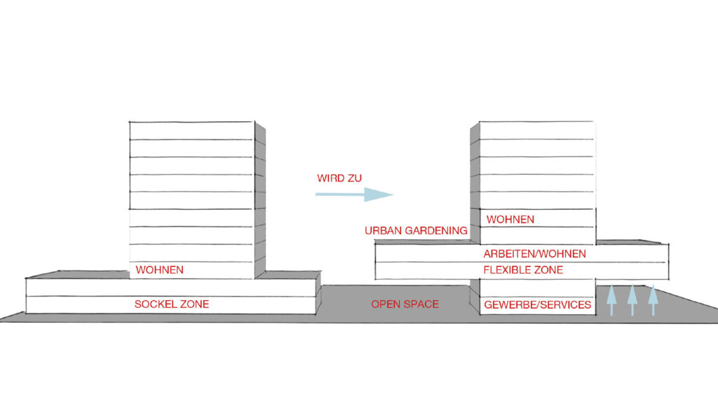 Die Fassaden werden mit PV-Systemen bestückt. Der regenerativ erzeugte Strom deckt im Jahresmittel den Gesamtstrombedarf der Gebäude. Als Stromspeicher dienen die Akkus von Elektroautos und Elektrorädern sowie das öffentliche Stromnetz. Eine intelligente Regelung sorgt dafür, dass die Wärmepumpen überschüssigen, solar erzeugten Strom in Wärme umwandeln.
