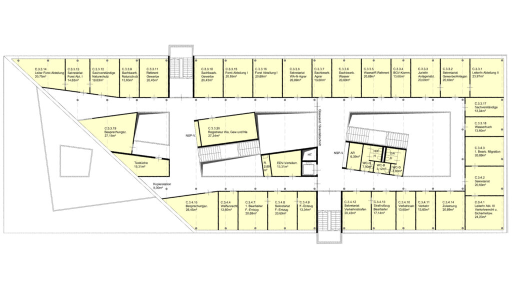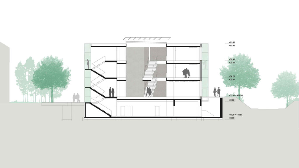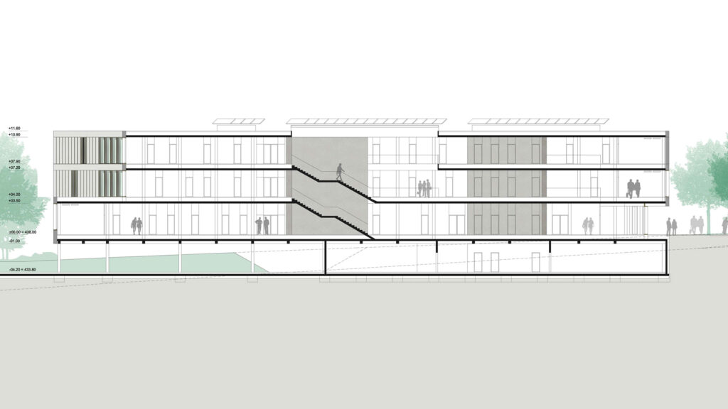 Je nach umgesetzter PV-Fläche kann das Gebäude zum Null- oder sogar Plusenergiegebäude angehoben werden – das Konzept sieht ausreichend Fläche für diesen Zweck vor. Wir reden hier von der Gesamtenergiebilanz ohne graue Energie – also den Energieaufwand für Heizung, Kühlung, Belichtung, Lüftung, Computer und Warmwasser