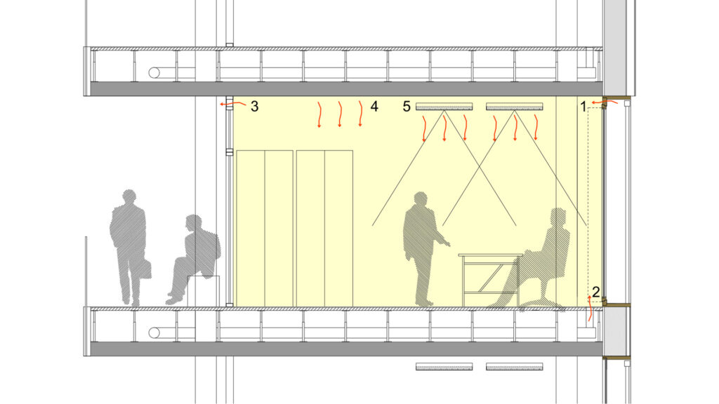 die klimatischen Verhältnisse nicht nahe der Raumlufttemperatur, wird die mechanische Lüftung in Betrieb genommen. Die Frischluft wird über eigene Lüftungsrohre im Zwischenboden an der Fassadenseite über Quellluftaustritte in die Räume geleitet. Die Abluft erfolgt durch schallabsorbierende Überströmöffungen über das Atrium in wird dort zentral abgesaugt. Die Wärme und Kälte der Abluft wird durch ein hocheffizientes, zentrales Lüftungsgerät rückgewonnen. Veranstaltungsbereiche und innen liegende Räume unterliegen einem dynamischen, kontrollierten, mindesthygienischen Luftwechsel. Dabei kommen moderne Lüftungsanlagen mit hocheffizenter