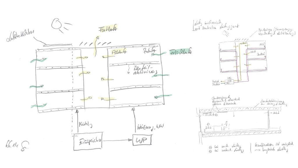 Im gesamten Gebäude kommen Flächenheiz- und Kühlsystem zum Einsatz. Teile der Betondecken und -wände werden thermisch aktiviert, so dass sie als thermischen temperierte Oberflächen und gleichzeitig als Speichermasse dienen. Das Gebäude wird damit in seinem thermischen Verhalten deutlich träger gegenüber inneren und äußeren Lasten. 06.06.2014Der Komfort für die Nutzer wird durch diese Maßnahme gegenüber konventioneller Bauweise mit abgehängten Decken signifikant gesteigert. Die aktivierten Oberflächen versorgt die Räume mit angenehmer Strahlungswärme und absorbieren überschüssige Wärme im Sommer. Die Betonwände im Atrium werden ebenfalls als thermischer Speicher und temperierte Oberflächen verwendet. Neben der Bauteilaktivierung kommen schnell reagierende Flächen bei schnell wechselndem Nutzerverhalten zum Einsatz. Das System ermöglicht ein gleitendes komfortables Klima, angelehnt an