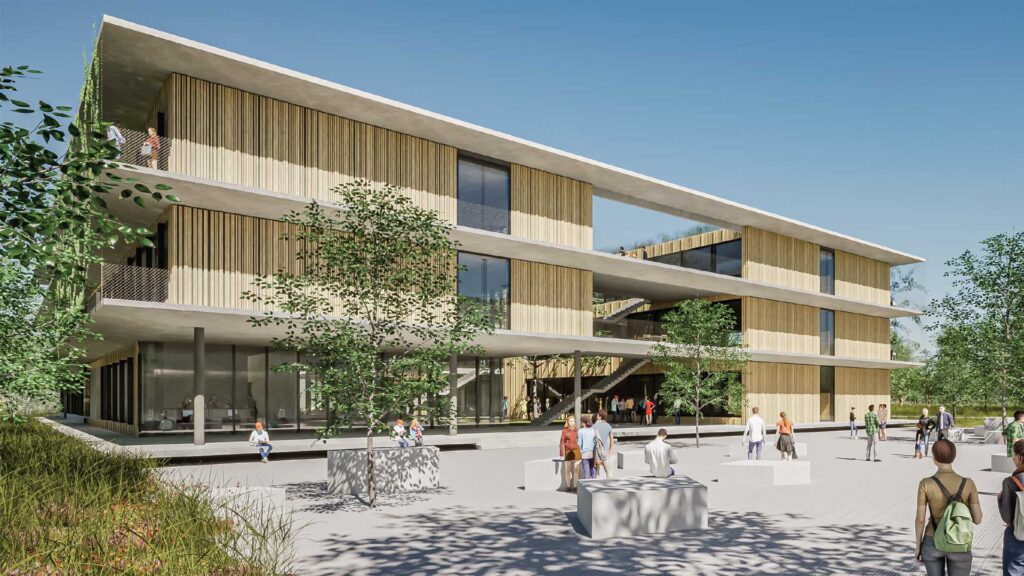 Alle Räume werden über eine thermisch aktivierte Betondecke geheizt und gekühlt. Die Frischluftversorgung erfolgt dezentral, kontrolliert und vorkonditioniert über die Fassade. Zur Spitzenlastabdeckung wird das System mit Umluftgebäsekonvektoren unter den Parabeten ergänzt. Die Abluft strömt durch den Gang und das Stiegenhaus über Solarkamine ohne Wärmerückgewinnung ins Freie. Die Abluft erfolgt dabei hauptsächlich natürlich und ohne Luftkanalsystem und ermöglicht zudem eine freie, nächtliche Auskühlung der Bauteilmassen. Innenliegende Räume und Räume mit entsprechenden Anforderungen werden mechanisch be- und entlüftet. Zur Stärkung der Klima Resilienz werden die äußeren Kühllasten durch konsequente, außenliegende Verschattungssysteme auf ein Minimum reduziert. Die Gebäudehülle auf Passivhausniveau minimiert die Transmissions- und Lüftungsverluste.