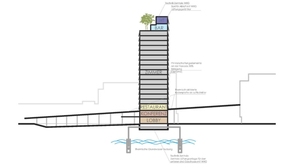 Die thermische Nutzung des Grundwassers mit einer Wärmepumpe deckt den Wärme- und Kältebedarf des Gebäudes. In Abhängigkeit der Jahreszeit bedingten Umgebungsbedingungen wird die Betonplatte über dem Parkdeck in Kombination mit einer Wärmepumpe zur Abdeckung von thermischen Lasten verwendet. Die Betonplatte über dem Parkplatz ist thermisch aktiviert und wird als riesiger Luftwärmetauscher zur direkten Kühlung im Winter (Wärmeabfuhr) und Wärmeentzug im Sommer zur Warmwasserbereitung verwendet. Gleichzeitig werden so im offen Parkdecke „als thermischer Abfall“ behaglichere Temperaturen erzeugt.