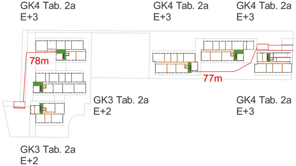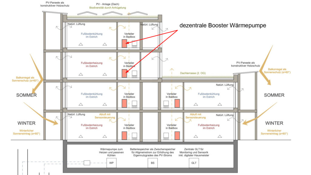 Durch die Kombination aus einer hocheffizienten thermischen Hülle und der konsequenten Vermeidung der äußeren Lasten im Sommer durch außenliegende Verschattungssysteme aller transparenter Flächen, werden alle passiven Maßnahmen gegen die sommerliche Überwärmung ausgeschöpft. Die Nachtauskühlung der Bauteilmasse durch Fensteröffnung wird bei Bedarf intuitiv vom Nutzer übernommen. Der Heizestrich wird im Sommer zum einen über den Wärmeentzug zur Warmwasserbereitung gekühlt. Zusätzlich kann der Boden direkt mit dem Grundwasser gekühlt werden. Diese sanfte Art der Kühlung beugt so einer sich aufschaukelten Überhitzung der Wohnungen ohne mechanisch erzeugte Kälte vor. Reduktion und Vermeidung von CO2 Emissionen: Die Holzkonstruktion der Gebäude reduziert den GWP des Gebäudes bei der Errichtung um 80%. Das vorgeschlagene Energiekonzept reduziert den jährlichen CO2 Ausstoß um fast 100t pro Jahr. Die Solarsysteme produzieren 125% des Gesamtenergiebedarfs der Gebäude und können somit als Plusenergiegebäude bezeichnet werden. Die Energiekosten für Heizung und Warmwasser reduzieren sich für die Mieter gegenüber der Referenzanlage Fernwärme um 50%. Das Energiekonzept trägt somit einen wesentlichen Beitrag für nachhaltiges und sozialverträgliches Wohnen bei.
