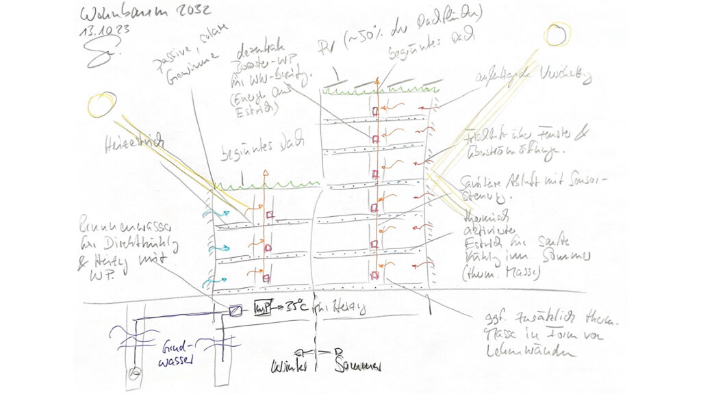 Die Kombination aus einer hocheffizienten thermischen Hülle und der konsequenten Vermeidung der äußeren Lasten im Sommer durch Verschattung aller transparenter Flächen reduziert den Energiebedarf als auch die notwenigen thermischen Lasten auf ein Minimum. Das Low Tech Konzept basiert auf der thermischen Aktivierung von Oberflächen, dem minimalen, technischen Einsatz für einen mindesthygienischen Luftwechsel in den Wohnungen sowie der Nutzung von regenerativen Energiequellen und lokale Energieressourcen zur Energieerzeugung. Die Holz-Bauweise reduziert die Herstellungsenergie auf ein Minimum. Ziel ist minimalen Energiebedarf bei maximalem Komfort für den Nutzer.